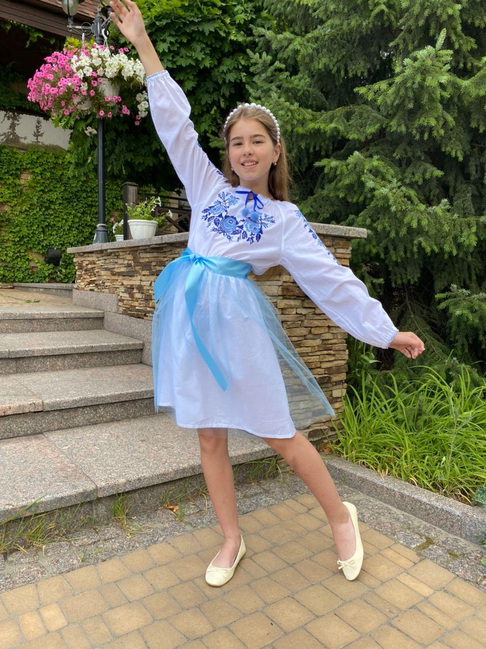 Дитяча національна сукня-вишиванка підійде для дівчаток. Передня частина та рукави дитячої народної сукні розшиті українським квітковим візерунком. Сукня-вишиванка для дівчинки має вільний крій та рукав на гумці. Дитяча вишита сукня україночки виготовлена з бязі. Горловина сукні з українською вишивкою для дівчинки прикрашена зав'язками з китичками на комірці та стрічкою на поясі. Низ дитячої національної сукні прикрашений декоративним фатином.