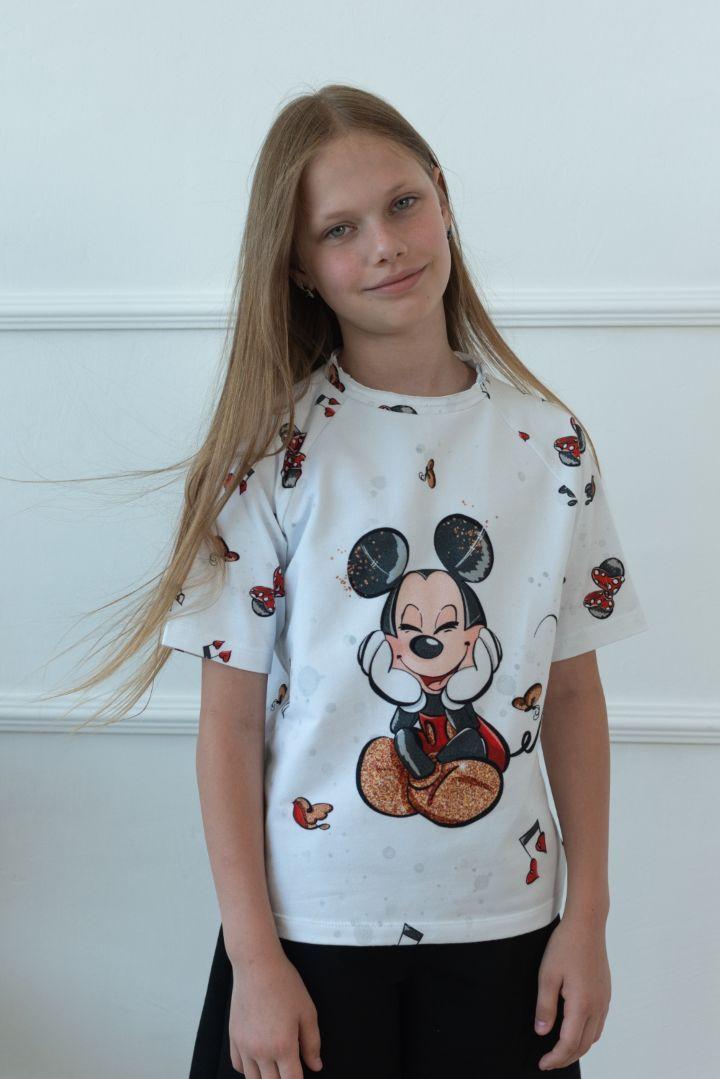 Футболка для дівчинки білого кольору виконана з матеріалу кулір з принтом Міккі. Виріб підійде на дівчинку зростом від 104 до 158 см.