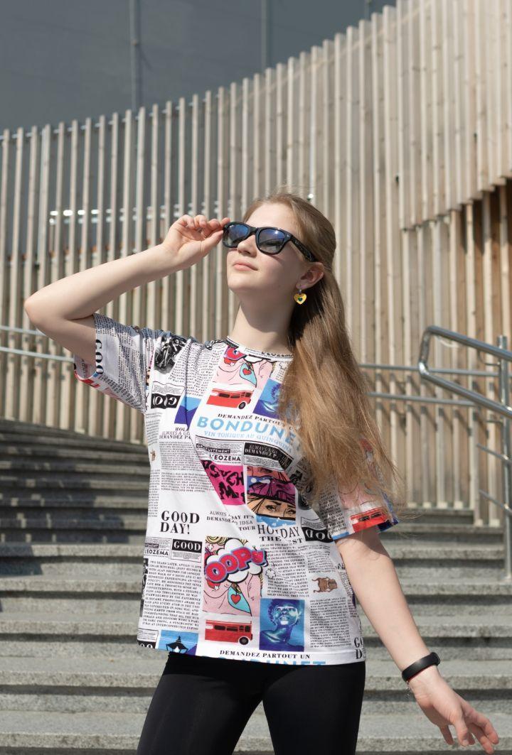 Оверсайз футболка для дівчинки виконана з матеріалу кулір з журнальним принтом. Виріб підійде на дівчинку зростом від 104 до 170 см.